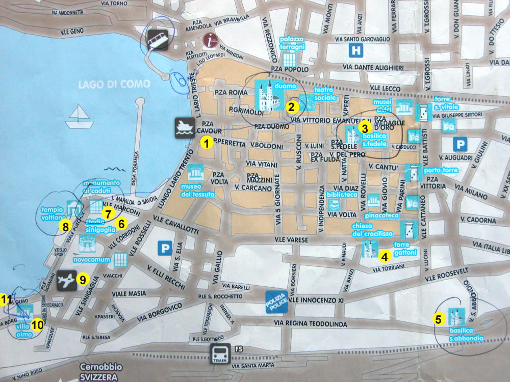 1 - place centrale 2 - cathédrale 3 - basilique San Fidèle 4 - église Crocifisso 5 - basilique San Abbondio 6 - monument ''les mains'' 7 - monument au Morts 8 - temple Voltiano 9 - base d'hydravion 10 - villa Olmo 11 - autres villas... |