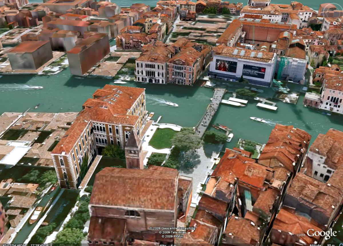 pont de l'academie la place San Vidal et son église, le Palais Cavelli Franchetti, le pont de l'Académie et l'Académie (copyright Google Earth)