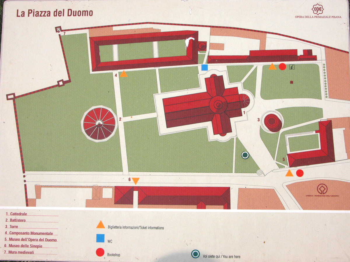 campanile le plan de l'ensemble : Cathédrale, Baptistère, Campanile(la Tour penchée), Camposanto, Musée de l'Opera et de Sinopie