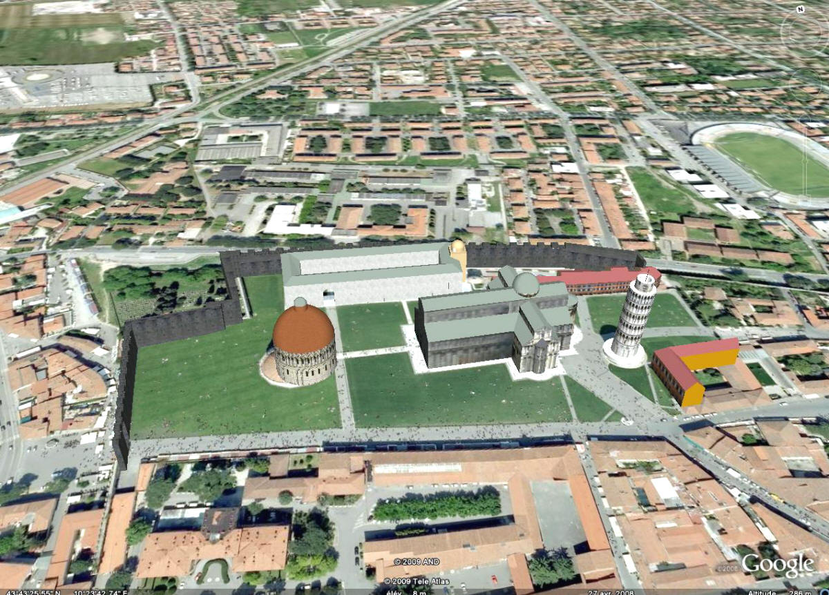 campanile le plan de l'ensemble : Cathédrale, Baptistère, Campanile(la Tour penchée), Camposanto, Musée de l'Opera et de Sinopie (copyright Google Earth)