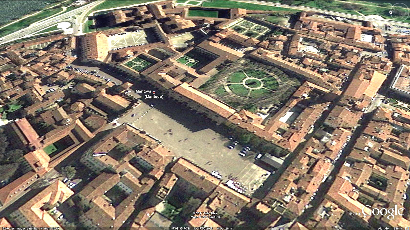 place castello Mantoue - la localisation de la Place Sordello - la Cathédrale de Mantoue - le Palais Ducale - la place Castello - le Château San Giorgio - la Basilique de Santa Barbara (copyright Google Earth)