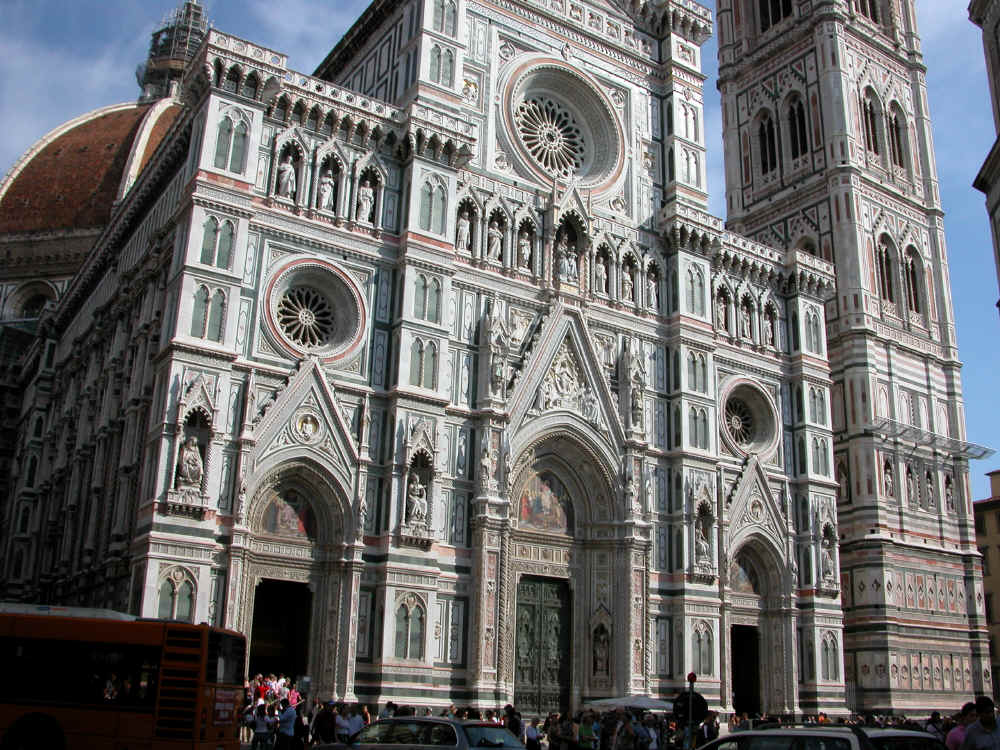 dome01                la magnifique façade de la cathédrale avec ses trois portails et ses trois rosaces et le bas du Campanile