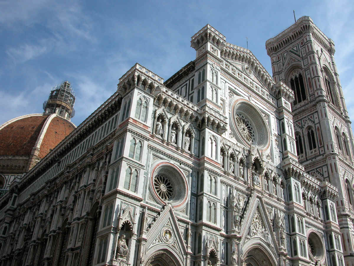 la magnifique façade de la cathédrale avec ses trois rosaces et le Campanile