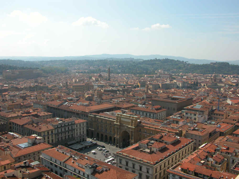 général01 vue ' sud, sud-est de Florence" à partir du Campanile; de gauche à droite : le palais Pitti, les églises Santo Spirito, Carmine et Cestello et plus proche la Place de la République et le Palais Strozzi