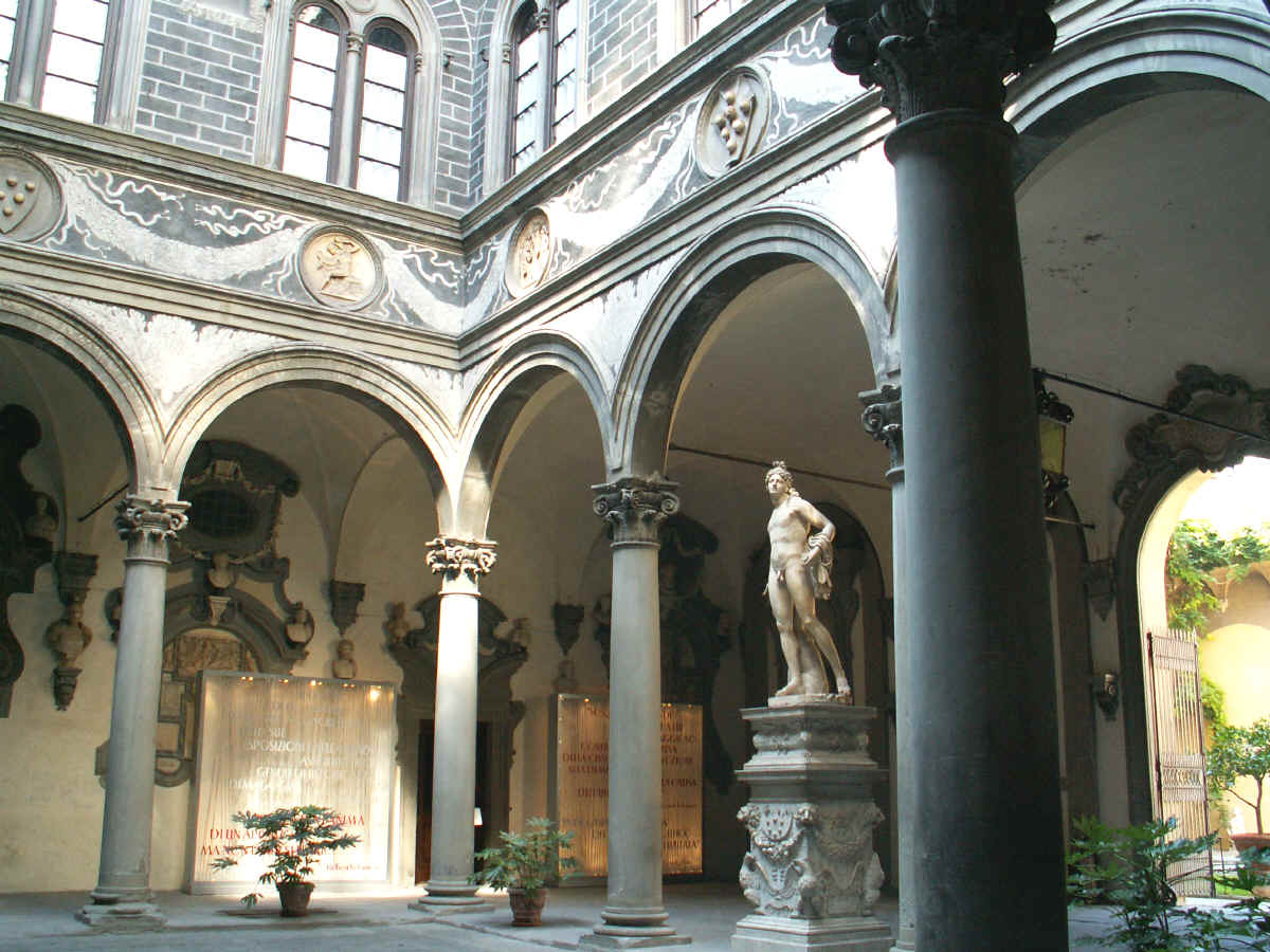medicis01 le Palais Médicis-Riccardi (Michelozzo_ 1444-1464) : la cour des Colonnes avec la statue d'Orphée de Bandinelli (1515)