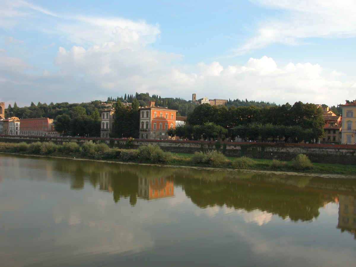 pontevecchio01 de gauche à droite en amont du Ponte Vecchio : la Tour Poggi (en partie), l'esplanade de Michel-Ange et l'église de San Miniato