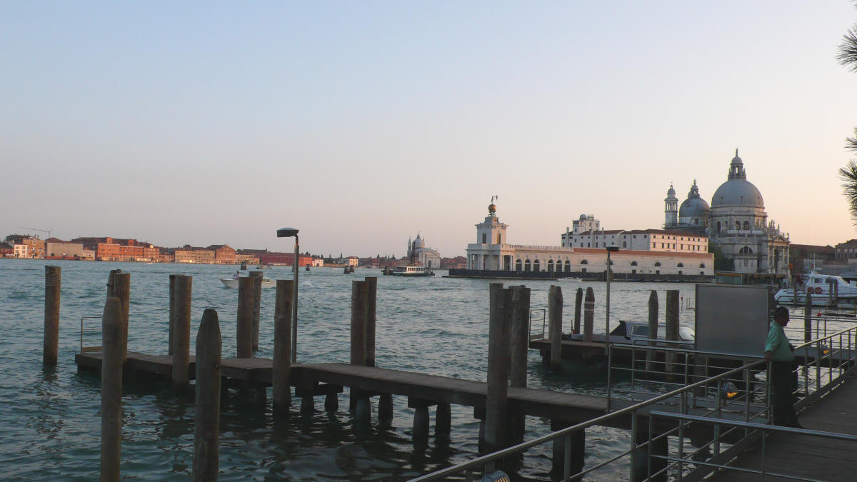santa maria salute à gauche au loin San Redentore, la Porte des Douanes et l'église Santa Maria della Salute au coucher du soleil