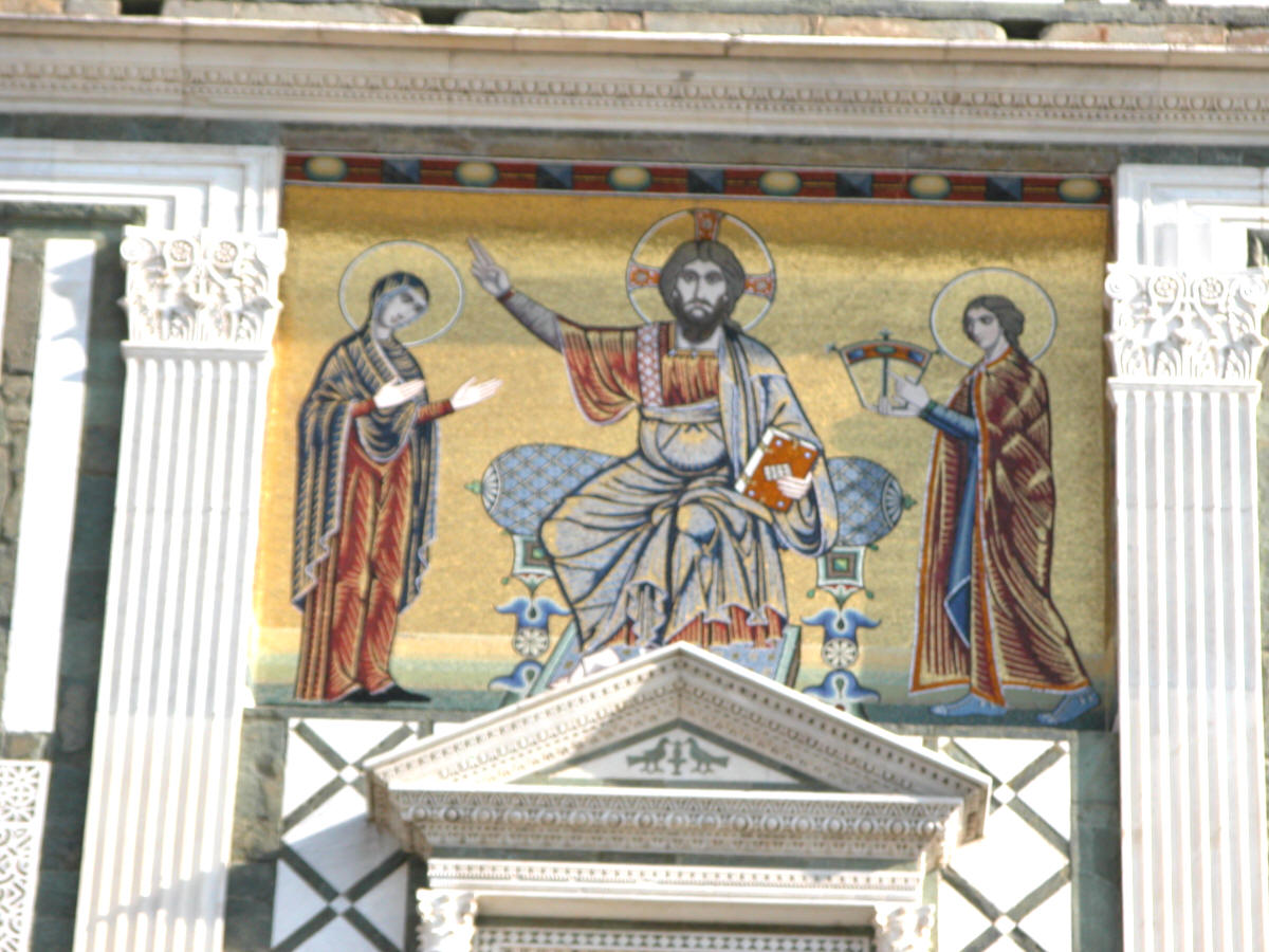 la Basilique de San Miniato (façade en marbre blanc - XI-XIIIème siècle) (mosaïque de 1297 représentant le Christ entre la Vierge et Saint Miniato)