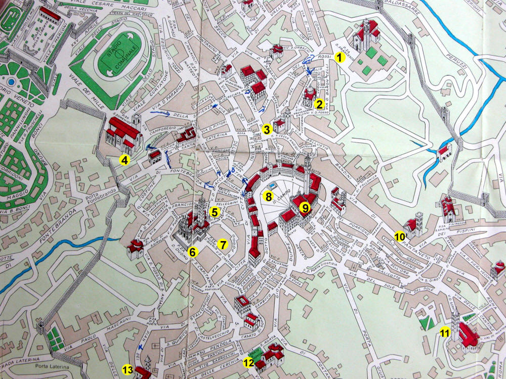 général (maj:20/06/2008) 1 - San Francesco 2 - Santa Maria Provenzano 3 - San Cristoforo 4 - San Domenico 5 - Baptistère 6 - Duomo 7 - Musée de l'Opéra 8 - Place Campo 9 - Palais Pubblico 10 - San Giorgio 11 - Basilique S.Maria Servi 12 - San Agostino 13 - San Niccolo Carmine