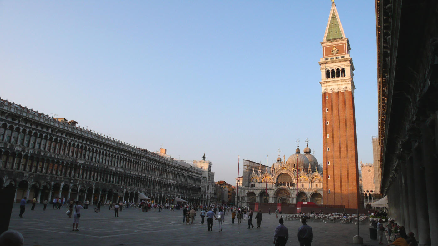 la place st marc la Procuratie Vecchie, la Tour de l'Horloge, l'entrée de la cathédrale Saint Marc et le Campanile au coucher du soleil....