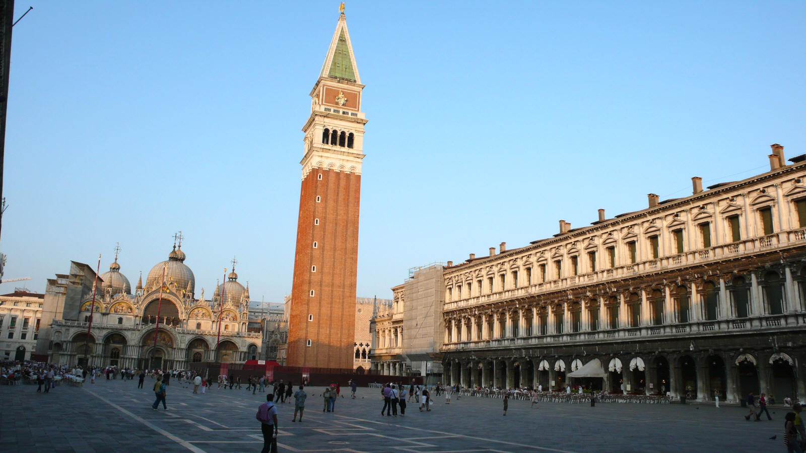 la place st marc l'entrée de la cathédrale Saint Marc, le Campanile et l'aile de la Procuratie Nuovo au coucher du soleil....
