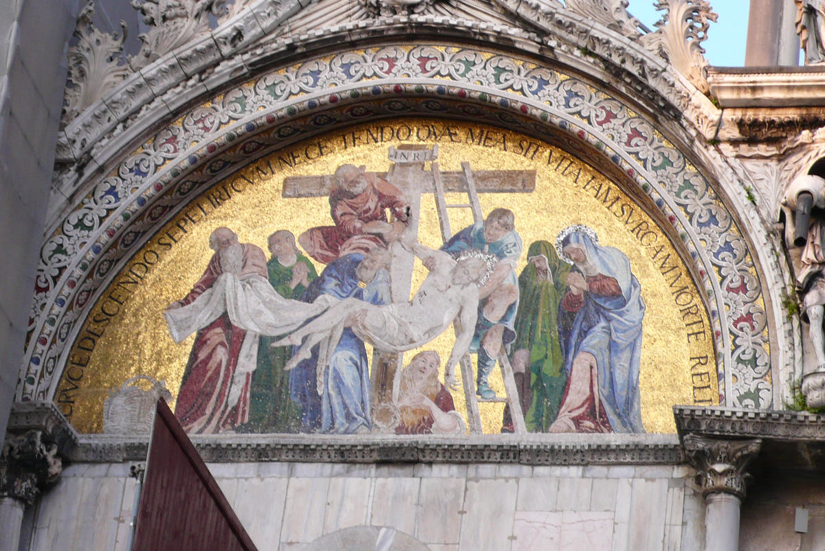 la place st marc mosaïque présentant la descente du Christ de la Croix sur l'arcade supérieure gauche à l'entrée de la cathédrale Saint Marc