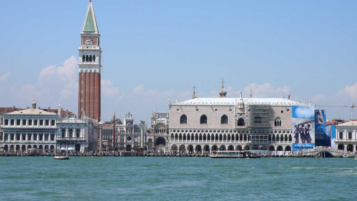 place st marc la bibliothèque de Sansovino, le Campanile, les colonnes de San Todaro et du Lion de St Marc, la Tour de l'Horloge et le Palais des Doges (cliquez sur la photo pour agrandir)