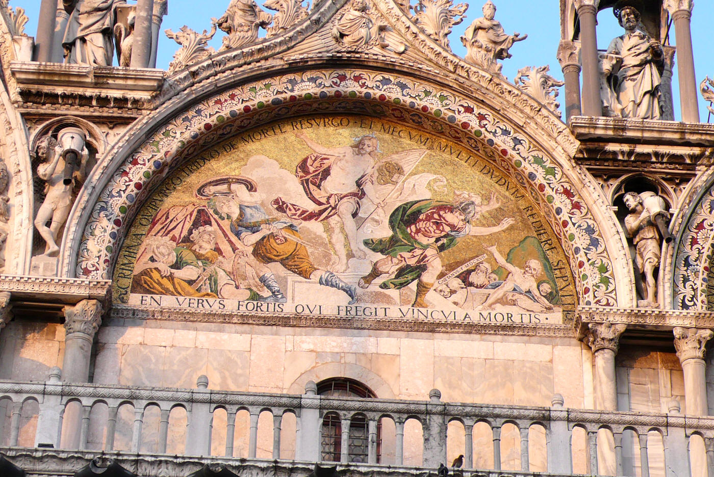 la place st marc mosaïque présentant la Résurrection du Christ sur l'arcade supérieure droite à l'entrée de la cathédrale Saint Marc