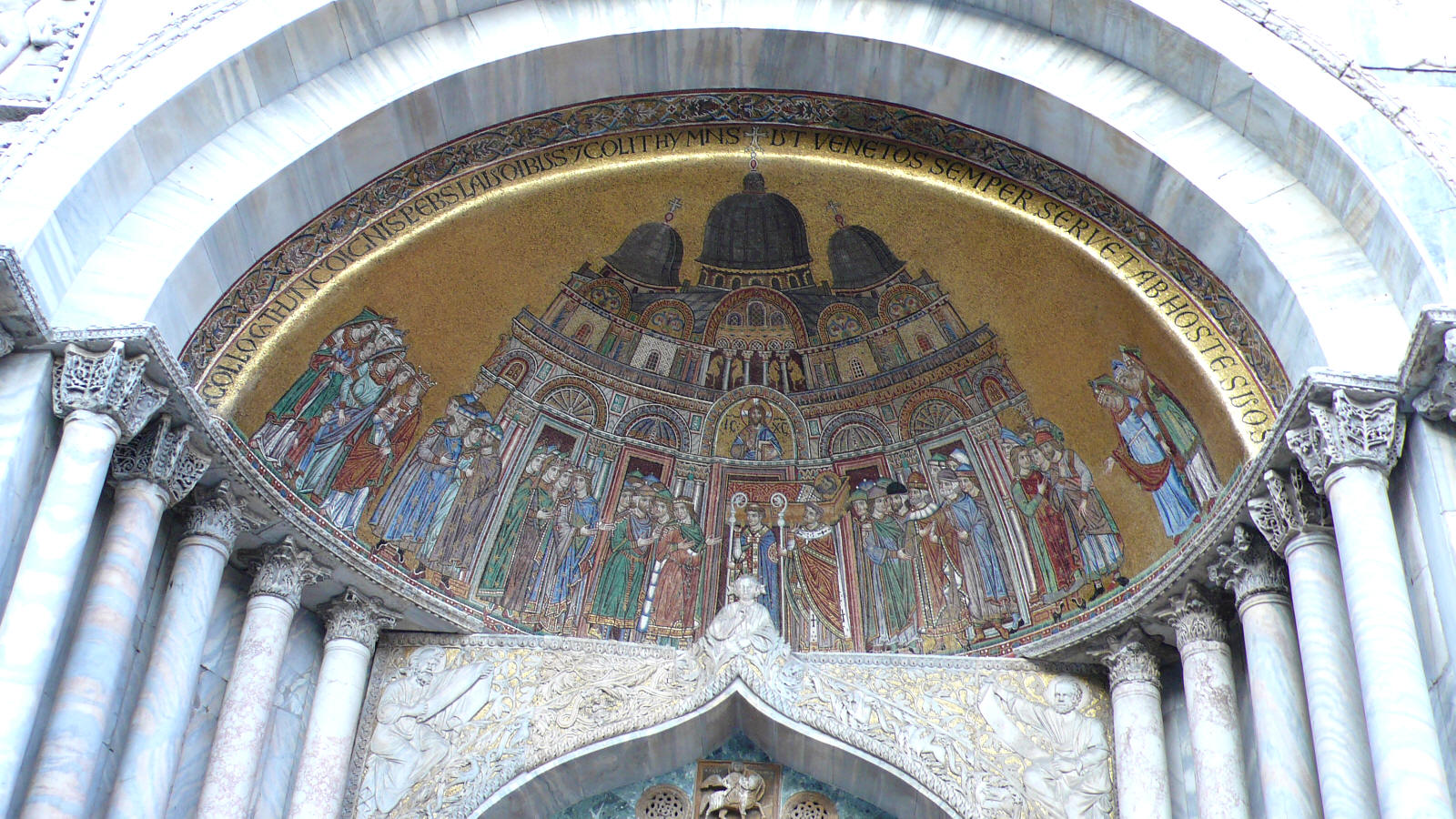 la place st marc mosaïque présentant le transport du corps de St Marc (arcade inférieure gauche à l'entrée de la cathédrale Saint Marc)