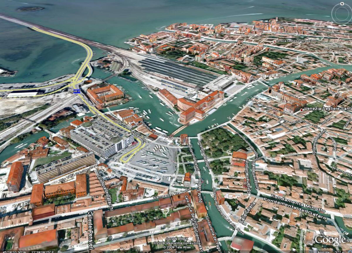 la gare localisation de la place Roma, de la gare Santa Lucia, du pont Scalzi et de l'église de Santa Maria de Nazareth (copyright Google Earth)